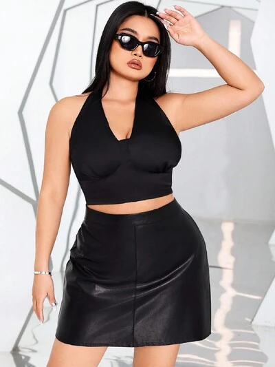 Plus Size Solid Color V-Neck Halter Cropped Tank Top