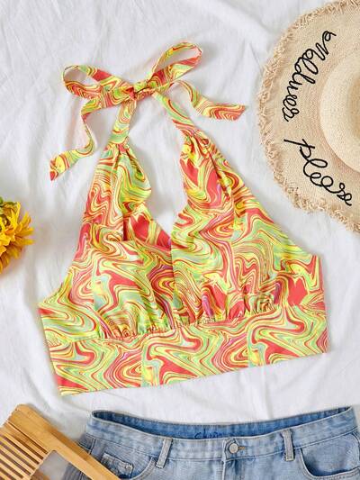 Plus Size Women's Marble Printed Halter Top For Vacation Style-30%