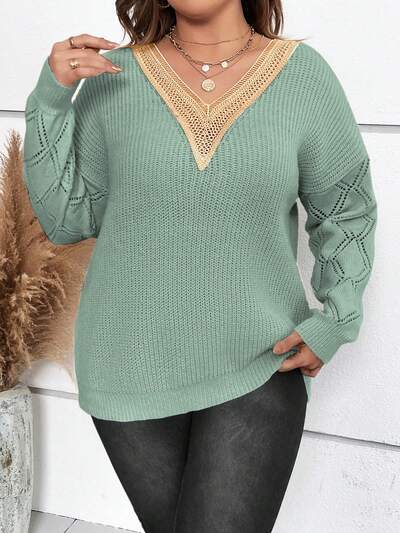 Plus Guipure Lace Panel Drop Shoulder Sweater Knit Pullover Fall Winter Sweater