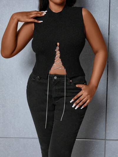Plus Chain Lace Up Front Knit Top