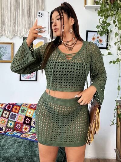 Plus Size Women's Fashionable Solid Color Hollow Crochet Lace-Up Swim Cover-Up Set-60%
