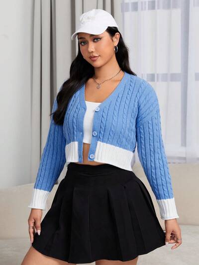Plus Contrast Trim Cable Knit Drop Shoulder Crop Cardigan-60%