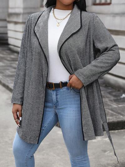 Plus Contrast Binding Waterfall Collar Belted Overcoat-60%