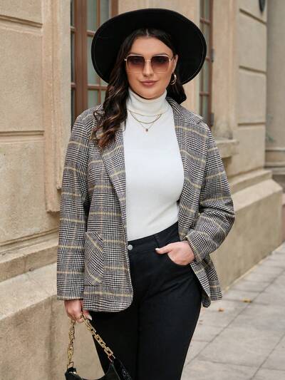Plus Houndstooth Print Lapel Neck Overcoat Fall Cloth For Women-60%