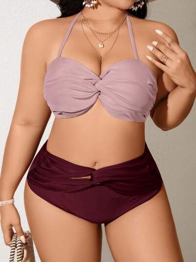Plus Size Women's Colorblock Twist Front Halter Separated Bikini Set Valentine Summer Beach-32%
