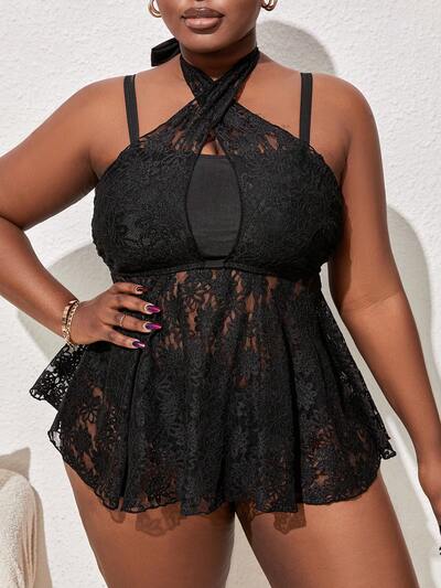Plus Size Cross Design Embroidered Mesh Cami Top And Triangle Panties Dress Swimsuit Set Summer-33%