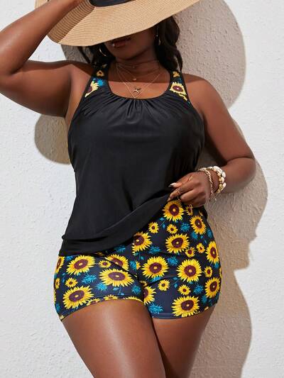 Summer Beach Plus Size Sunflower Print Shorts Tankini-33%