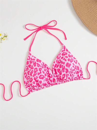 1pc 2025 Plus Size Women Leopard Print Halter Tie Front Sexy Bikini Top Summer-33%