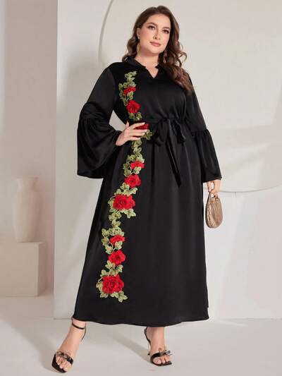 Plus Size Color Block Tape Decorated Floral Print Bell Sleeve Jalabiya Dress With Belt, Elegant Luxury Evening Party Style