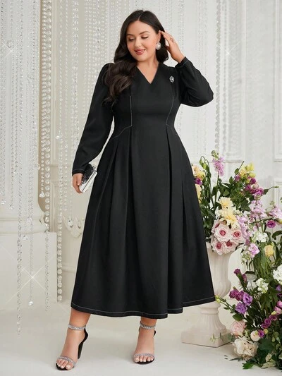 Plus Size Pleated Spliced Dress With Gold Foil Print Long Evening Dresses