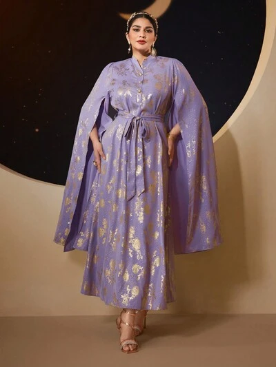 Plus Size Cape Sleeve Dress With Notched Neckline And Gold Foil Print, Elegant Luxury Evening Party Style Kaftan Jalabiya Dress