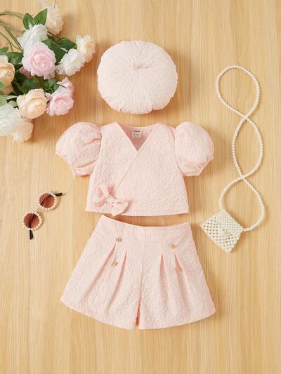 Baby Girl Solid Color Textured Short Sleeve Top, Shorts And Hat Set With Bow Decoration-42%