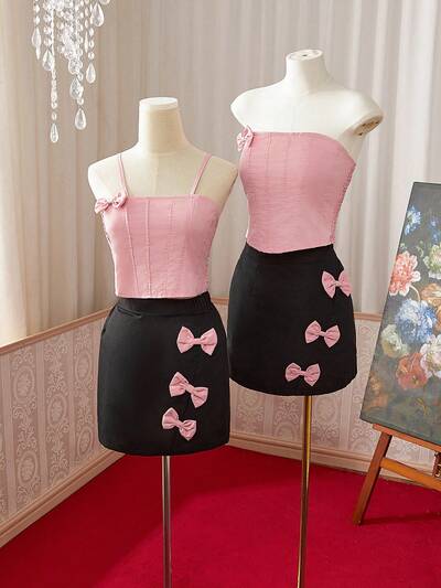 Teen Girl Fashionable Bowknot Decorated Top And Skirt Set
