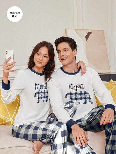 Women's Letter & Plaid Patterned Long Sleeve Pants Homewear Set-65%