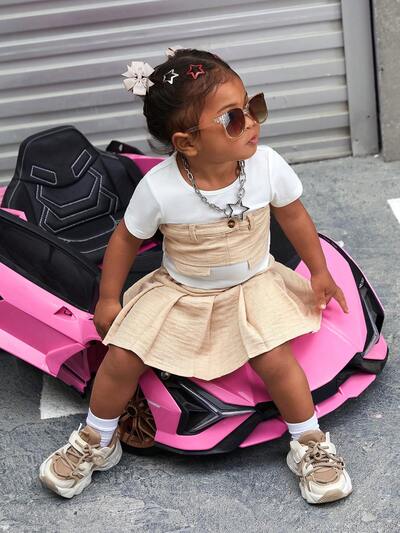 Baby Girl Casual Fashionable Holiday Style Colorblock Short Sleeve Top And Pleated Skirt Set
