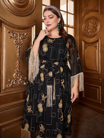Plus Size Fringed Decor Belted Jalabiya Dress, Elegant Luxury Evening Party Style-55%