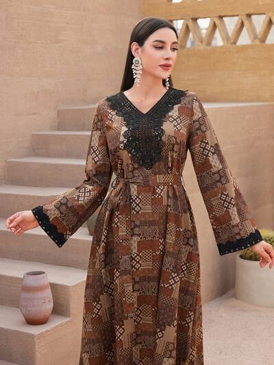 Ladies' Full Printed Lace Spliced Arabic Style Dress-65%