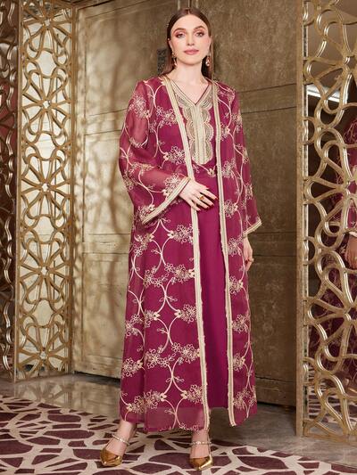 Burgundy Red Lady'S Floral Embroidered Jacket And Dress Set, Moroccan Caftan, Elegant Luxury Evening Party Style Abayas-65%