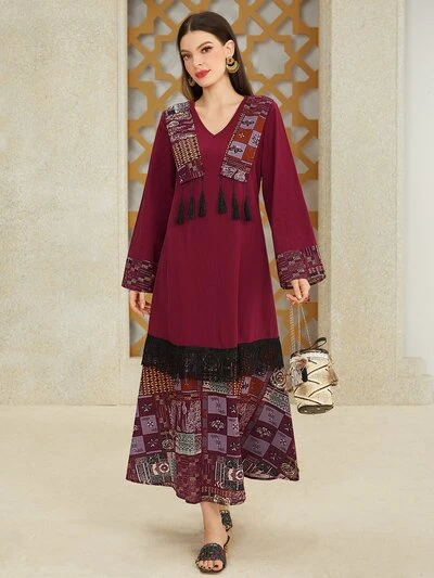 Ramadan V-Neck Tassel Decoration Flare Sleeve Dress-63%