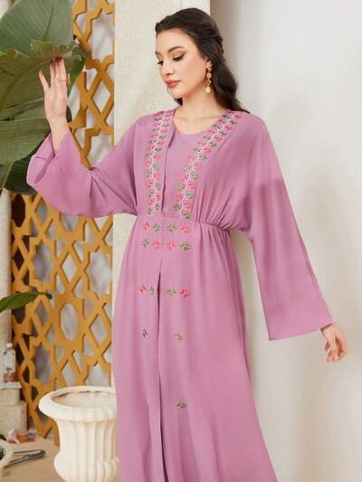 Women's Plus Size Floral Embroidery Flared Sleeve Arabian Clothing Kaftan Jalabiya Dress-64%