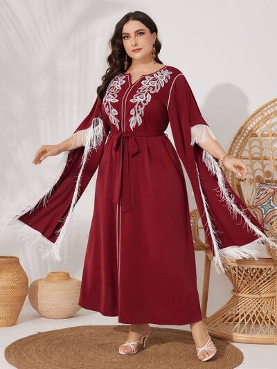 Burgundy Red Plus Size Women's Arabian Clothing With Botanical Pattern Patchwork And Tassel Hemline-65%