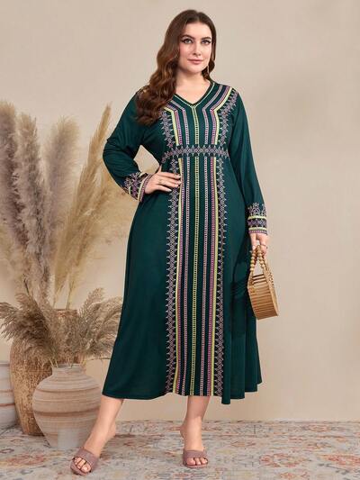 Plus Size Geometric Pattern V-Neck Long Sleeve Dress Kaftan Jalabiya Dress-61%