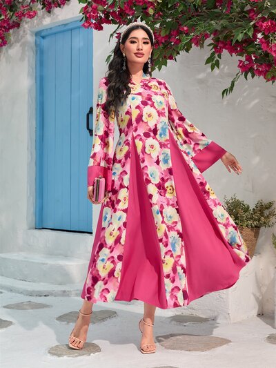 Striped & Floral Print Notch Neck Tunic Dress, Modest Kaftan-60%