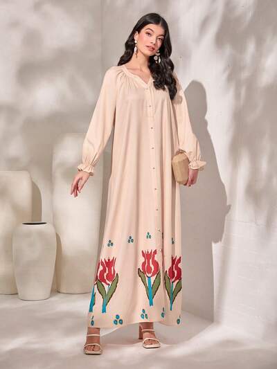 Graphic Print Flounce Sleeve Button Front Arabian Dress-16%