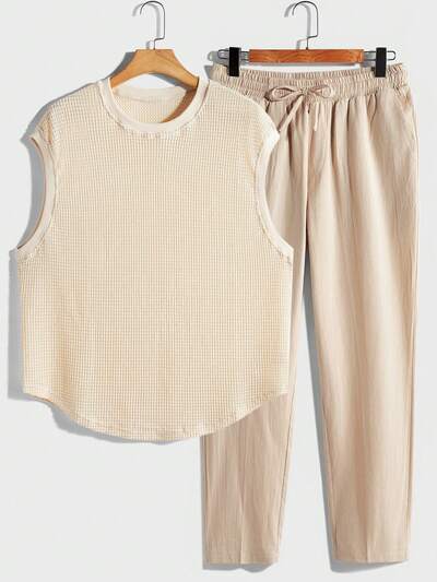 Men Loose-Fit Knitted Jacquard Sleeveless Top And Long Pants Two-Piece Set In Apricot-65%