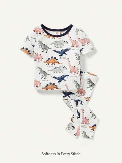Baby Boy Snug Fit Pajamas Set, Dinosaur Pattern Color-Blocked Round Neck Short Sleeve Top With Casual Pants-41%