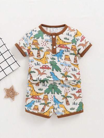 Baby Boy Snug Fit Pajama Set, Cartoon Animal Print Short Sleeve Top And Casual Shorts, 2pcs