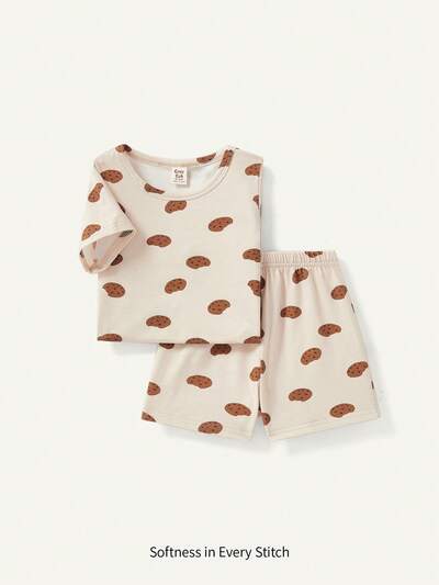 Baby Boy'S Casual Cookie Pattern Round Neck Short Sleeve Top And Shorts 2Pcs Outfit Matching Sets