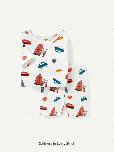 Baby Boy Snug-Fit Pajamas With Car Pattern Rounded Neck Short Sleeve Top And Short Set-50%