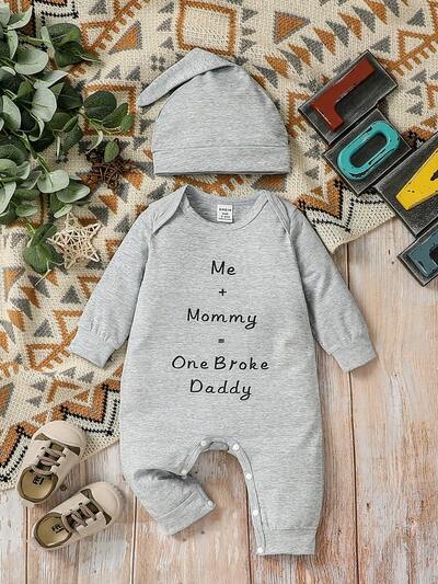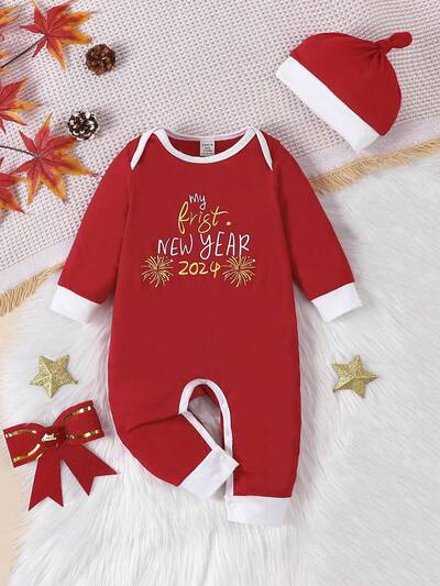 Newborn Baby Boys' New Year Slogan Printed Jumpsuit And Hat Set, For Christmas-43%