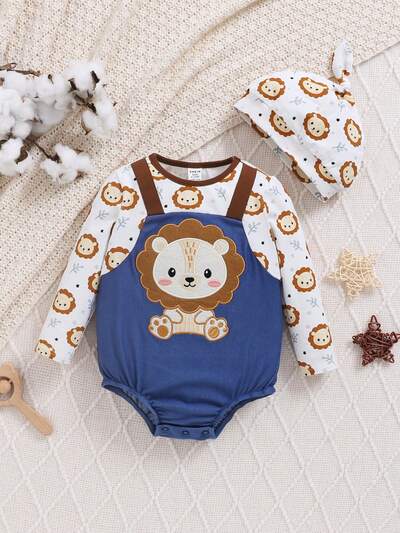 Baby Boy Cartoon Animal Pattern Color Block Round Neck Long-Sleeved Bodysuit And Hat Two-Piece Set-60%