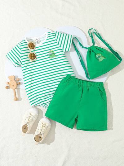 Baby Boy's Striped Dinosaur Print Short Sleeve Bodysuit And Shorts Set With Bag, Summer