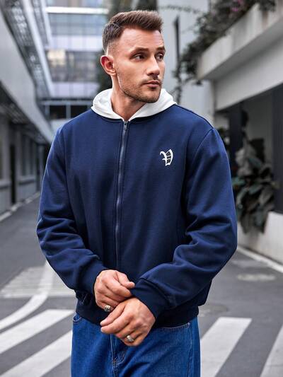 Men's Plus Size Letter Print Color Blocking Hooded Jacket, For Fall Winter-65%