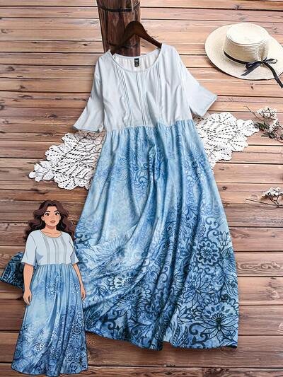 Plus Size Summer Contrast Floral Short Sleeve Dress