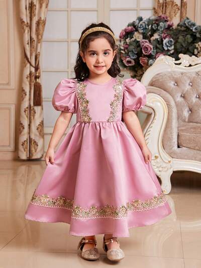 Young Girl's Gorgeous Mesh & Jacquard Patchwork Puff Sleeve Dress With Sheer Sleeve, Round Neck-46%