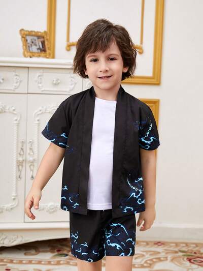 Young Boys Shark Printed Short Sleeve Shirt And Shorts Set