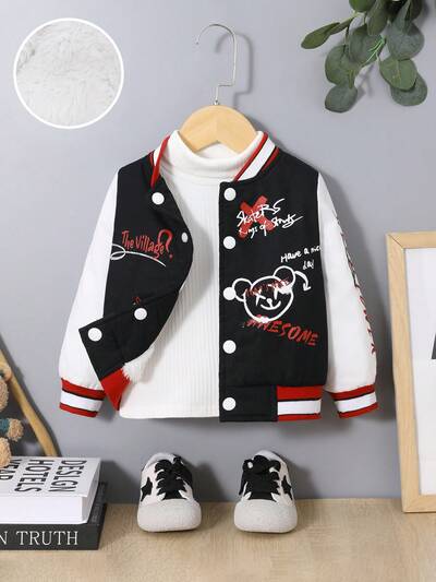 Baby Boy Letter & Cartoon Graphic Striped Trim Bomber Jacket Without Hoodie-42%