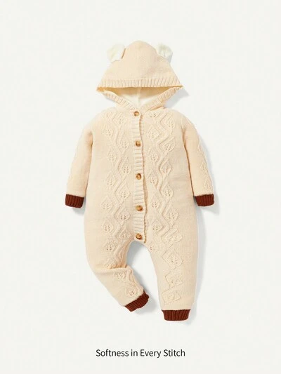 Baby Girl Graphic Pattern Contrast Trim Button Up Hooded Thermal Lined Knit Jumpsuit-50%