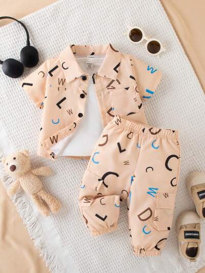 2pcs/Set Baby Boy Vintage Print Short Sleeve Top And Shorts Set, Summer