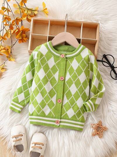 Baby Diamond Pattern Crew Neck Button-front Cardigan-45%