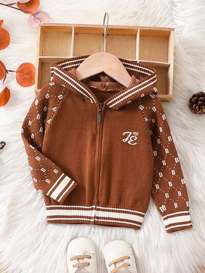 Baby Boy Letter Pattern Striped Trim Hooded Cardigan-60%