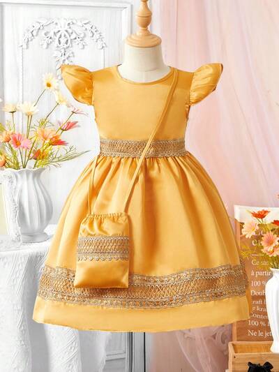 Young Girl Bag Print Puff Sleeve Dress