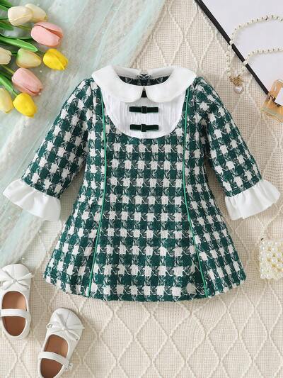 Baby Girl Plaid Print Peter Pan Collar Flounce Sleeve Dress-60%