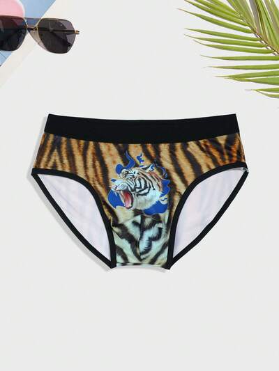 Men's Tiger Pattern Printed Colorblock Triangle Underwear With Contrast Trim-65%