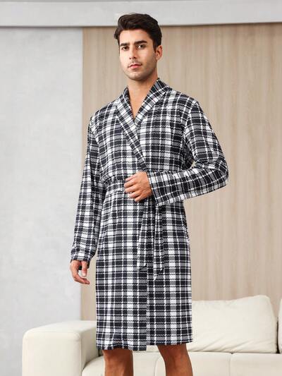 Men Checkerboard Print Dual Pockets Belted Robe-65%