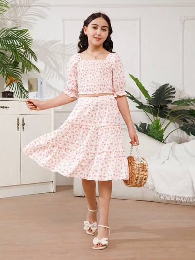 Tween Girl Light Pink Square Neck Mid-Sleeve Top And Light Pink Loose A-Line Skirt Family Matching Outfits (4 Sets Sold Separately)